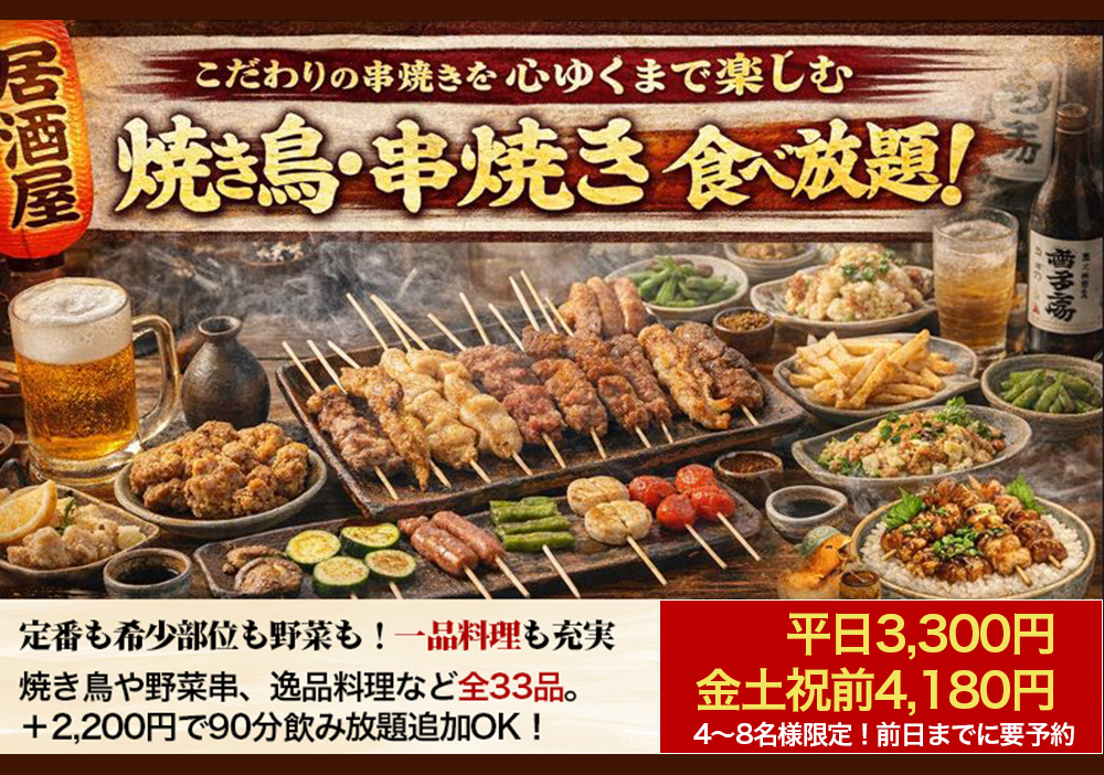 焼き鳥食べ放題が新登場!4〜8名様限定の五鉄の新プラン