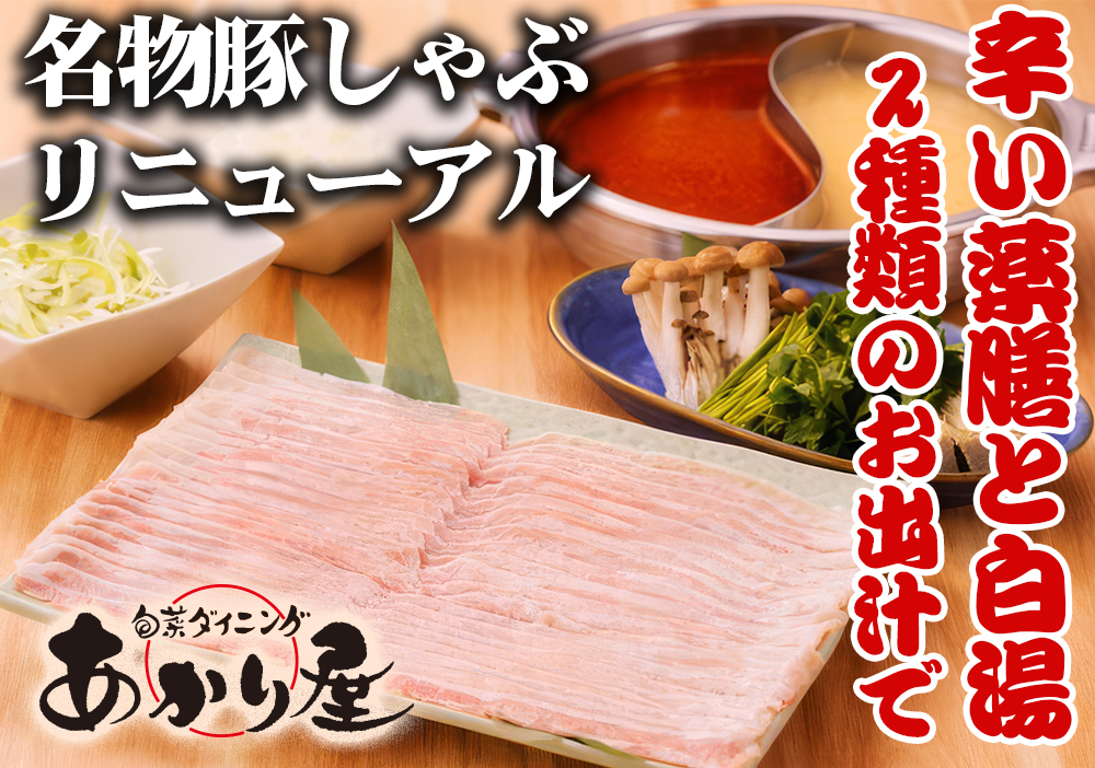 たっぷりのお野菜と一緒に厳選豚を辛い薬膳と鶏白湯鍋でいただく、絶品しゃぶしゃぶ。2種類のお出汁で味わう新名物のしゃぶしゃぶをぜひ、あかり屋でご賞味ください。