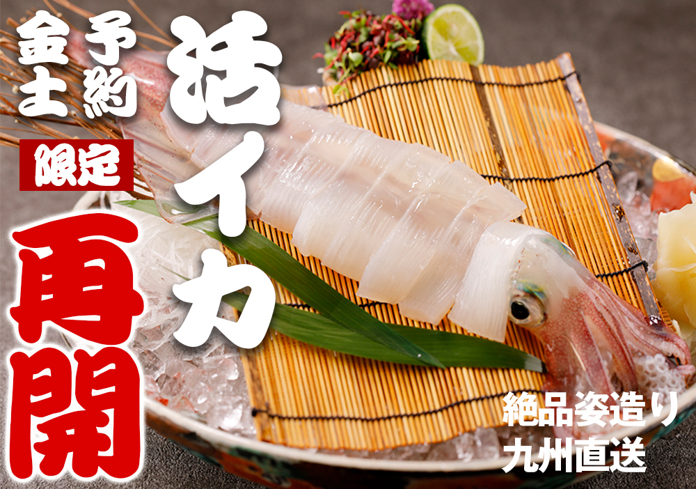 2026.03.26 ニューストピックスピックアップ 活イカの姿造り金土予約限定で再開しました。 First dining コロナ禍前に人気だった活イカの姿造り。 金土予約限定で再開致しました。多くの方に喜んでいただいた活イカの姿造りですが、ようやく再開することが可能となりました。 金土の予約限定ですが、ぜひ予約してお召し上がりいただけたらと思います。 金沢駅近くの居酒屋でしっかり水槽で管理している新鮮なイカをご賞味あれ。 1杯5,000円(税込5,500円) 1杯で約4~5人前 金沢駅近くで活イカ姿造りを楽しめる居酒屋 ・せん金沢駅前 ・水魚 ・べに屋 ・魚せん広岡 ・とと屋